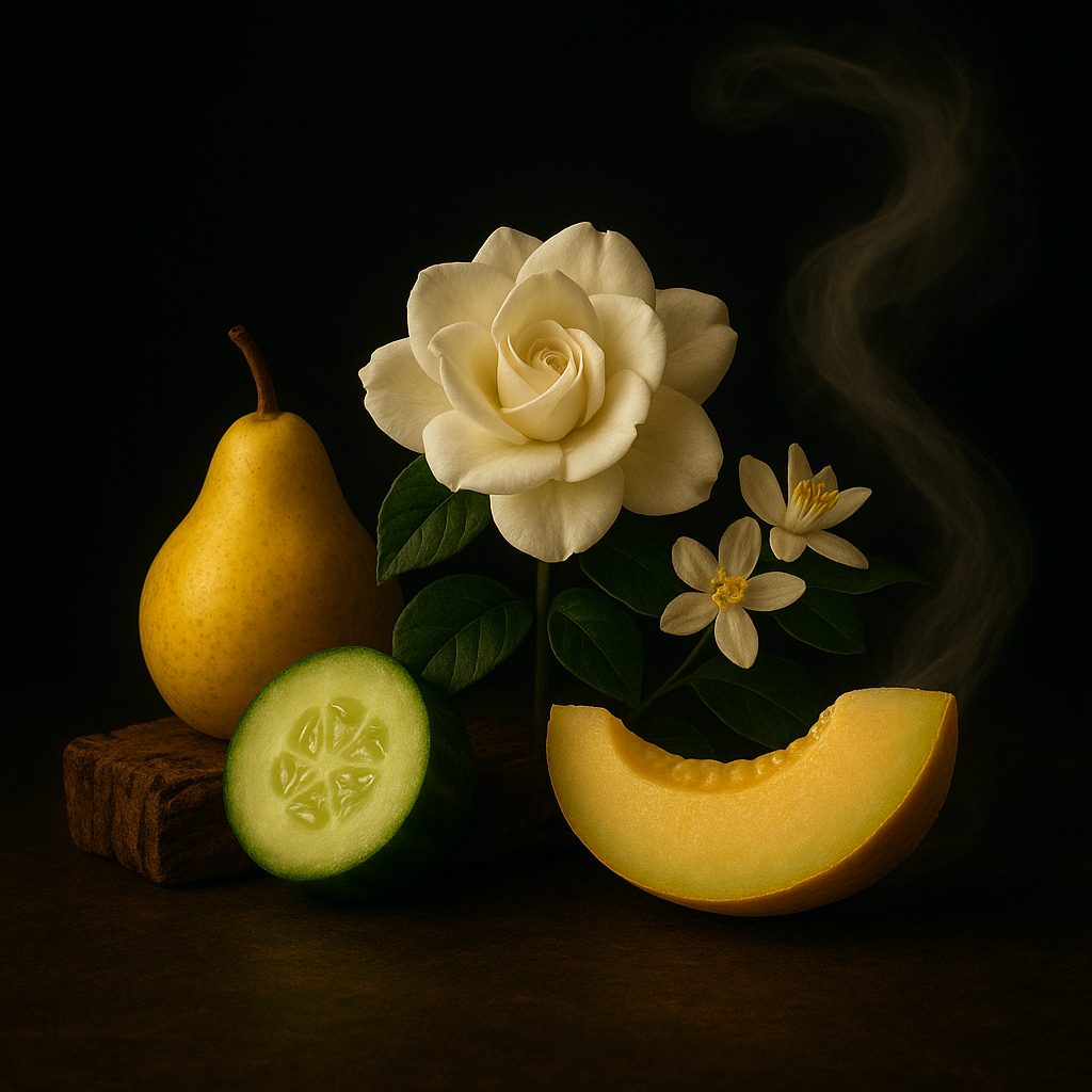 OPALINE VEIL Gardenia Pearing with Cucumber Melon offers a rich, timeless elegance with its lush and refined white floral composition. This creamy blend exudes sophistication and classic charm.
